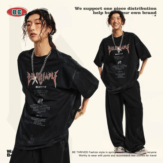 DB Men's Vintage Letter Printing Cotton T-shirt, Oversized, Washed, Short Sleeve, Casual Streetwear, Retro, Summer, Tees, 45018